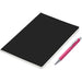 An economical notebook and pen set, especially suited for meetings, conferences and events. Packaging the notebook and pen in a pouch makes it easy to transport and to distribute these writing sets. This set consists of a black A5 notebook with a pen available in a variety of colours. The pouch has a stud button closure, and it’s made predominantly from recycled material.